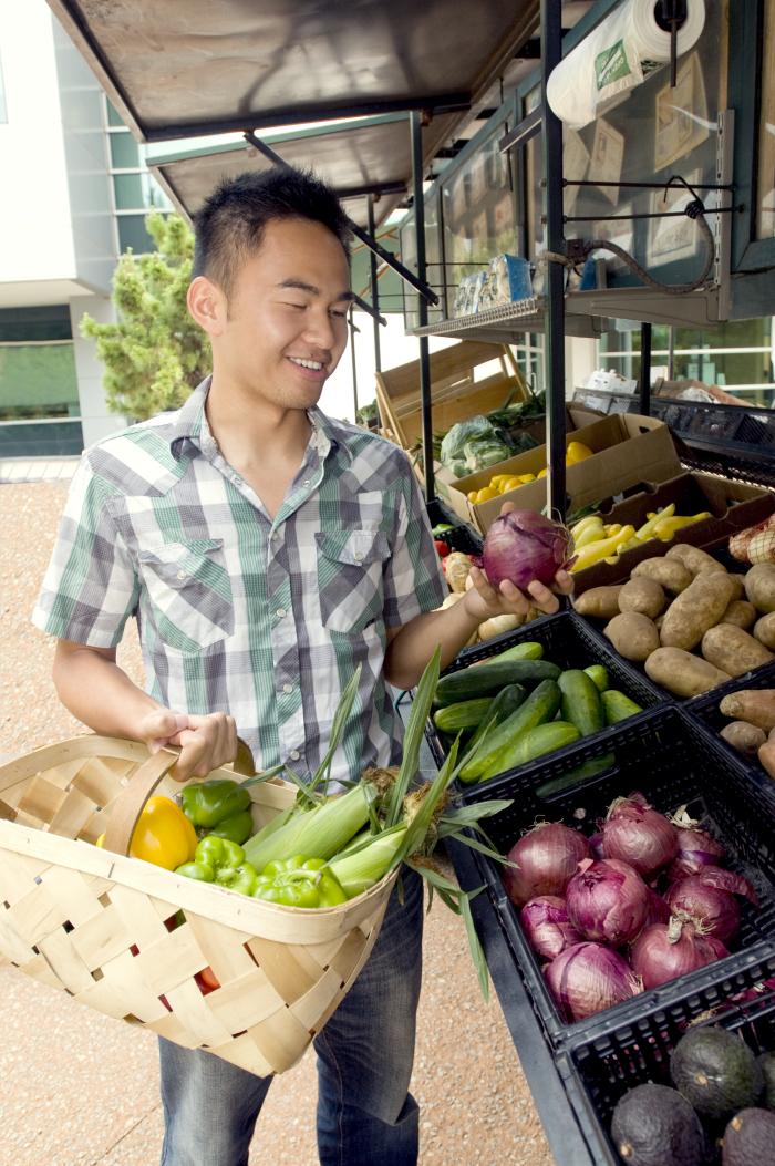 This man was photographed as he was shopping for groceries at a mobile Georgian farmers market, at a point in his activity, where he was picking out a purple onion in the market’s produce section. Here, he appears to have made his choice, holding the onion in his left hand before adding it to a woven wooden basket filled with other produce products he’d chosen during his shopping activity.