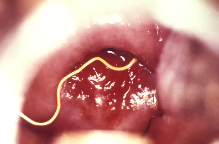 This image depicts a close colposcopic view of a cervix, in the case of a patient, who had presented to a clinical setting with a cervical inflammation, known as cervicitis. Note what appears to be a cord attached to an implanted intrauterine device (IUD). Note the edematous, and erythematous appearance of the cervix.