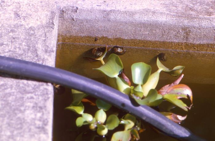 Photographed in 1964, on the Caribbean island of Puerto Rico, this image depicted a close view of one of the stock ponds, inside a snail hatchery. You can see a number of Marisa spp. snails, being raised under these controlled conditions, which would later be released into the wild, in order to prey on the populations of Australorbis spp., also known as Biomphalaria spp. snails, which are hosts to the parasitic worm, Schistosoma mansoni, the cause of human schistosomiasis.