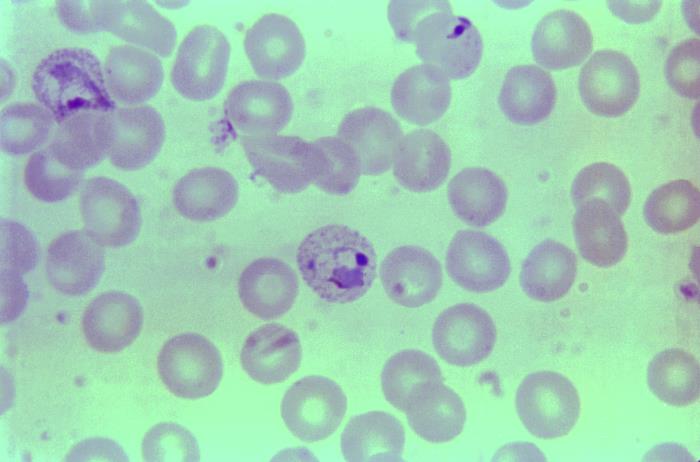 Under a magnification of 1125X, this thin film blood smear photomicrograph, highlighted the presence of a growing, Plasmodium vivax trophozoite which displayed Schüffner’s dots.