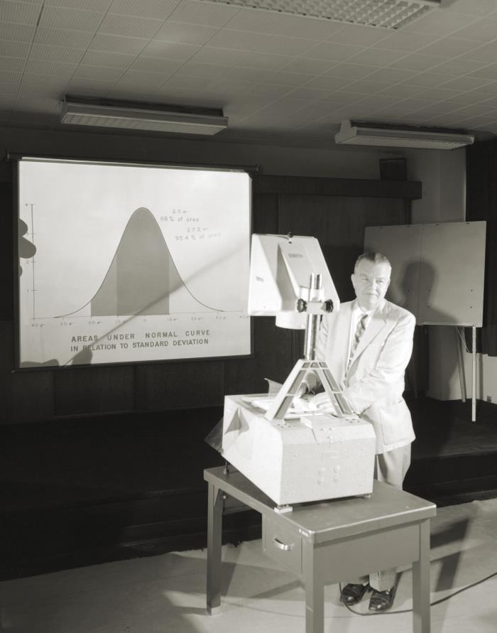This historic image, captured in 1959, depicts Dr. Martin standing beside an overhead projector while presenting a chart projected onto a screen. The chart illustrates a bell curve configuration, with the subheading, “Areas Under Normal Curve in Relation to Standard Deviation.” The underlying data for the chart was not identified.