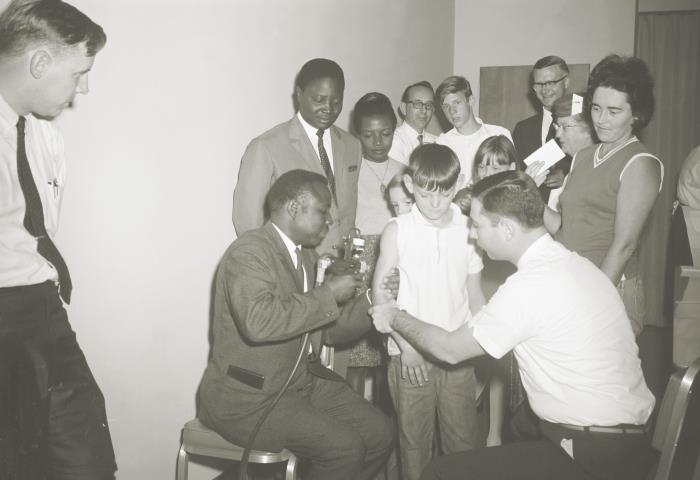 This historic image from 1967, depicted a scenario that had taken place during a measles immunization project held in Cobb County, Georgia. In this scene, Dr. Maximillian Yekpe, Chief of Smallpox Eradication Service and Consultant in Dahomey (now Benin), West Africa, was in the process of administering an immunization to a young boy’s upper right arm, while using a Hypo-Spray® Jet Injector. Standing behind Dr. Yekpe, were foreign dignitaries, Dahomey Health Minister, Dr. Daouda Badarou, and his wife, Dr. Emilie Badarou.