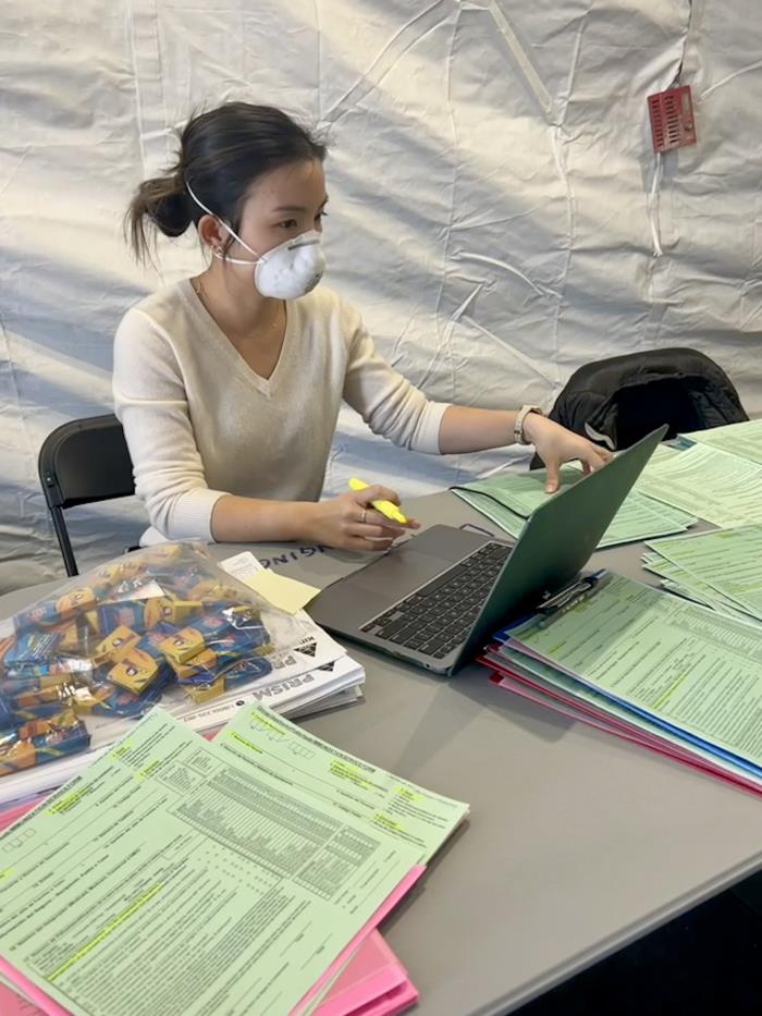This image depicts Epidemic Intelligence Service (EIS) Officer, Amy Nham (Class of 2023), as she was reviewing measles screening forms at the intake center for new arrivals, while in Chicago, Illinois, during the 2024 Chicago measles outbreak.