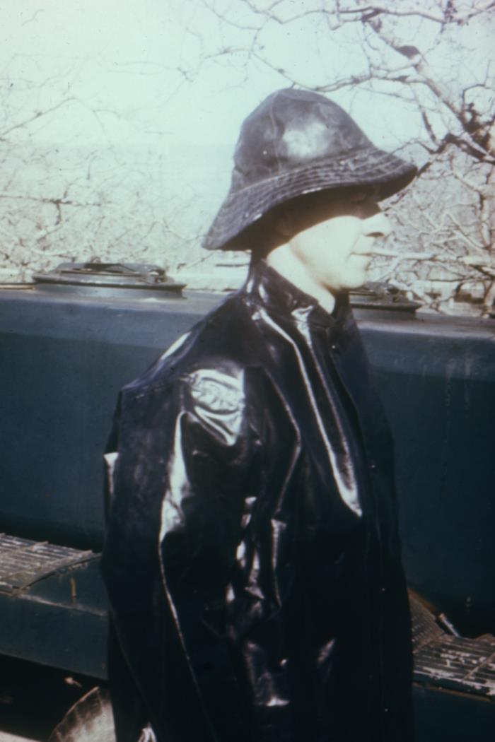 This historic 1970 photograph depicted an individual, who was demonstrating the types of personal protective equipment (PPE), which at that time, was worn by pesticide workers. Advances in fiber technology have led to lighter clothing materials that can protect without inhibiting movement, or the technician’s field of vision.