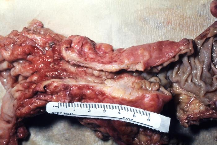 This image depicts a gross section of colonic tissue recovered during its surgical excision, revealing the organ’s interior mucosal lining, and what is referred to as a napkin ring, adenocarcinomatous lesion, encircling the intestine. Note the thickened colon wall, reducing the luminal diameter.