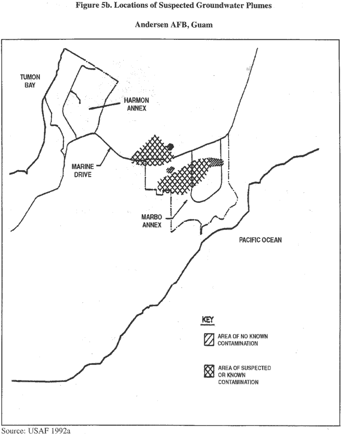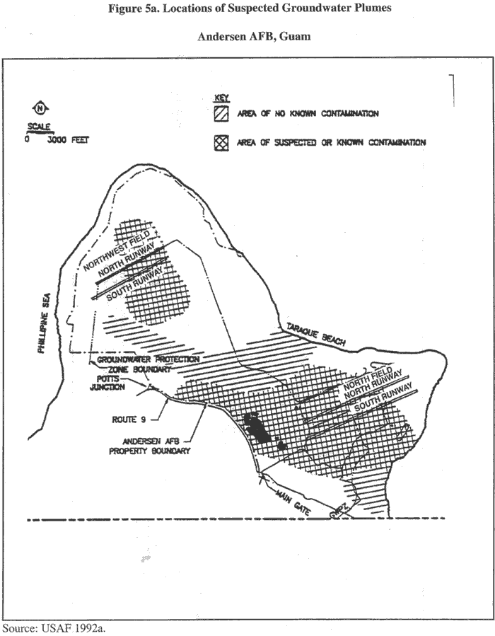 - The Air Force installed monitoring wells and has begun to identify groundwater plumesassociated with Andersen AFB operations. Limited soil sampling and soil gas surveying hasalso been conducted.