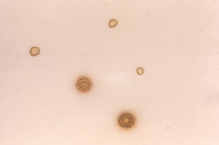 This photograph depicts a number of Mycoplasma hominis T-strain microcolonies, which had been grown on agar medium. Note the fried egg appearance of these colonies.
