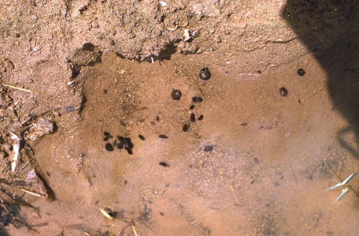 This photograph, captured in 1964, on the Caribbean island of Puerto Rico, depicted a number of Australorbis spp. snails, also known as Biomphalaria, which were inhabitants of a stream, suspected of harboring i>Schistosoma spp. parasites. Members of this snail genus are known to host these human pathogens. It has been found, that these snails are actually integral hosts to the schistosome life cycle, releasing mature cercariae into the stream, which can then infect humans, who enter this water environment, by penetrating the skin surface.