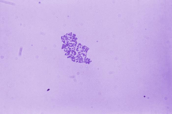 This photomicrograph depicts a cluster of Gram-positive, sphere-shaped bacteria of the genus Staphylococcus.