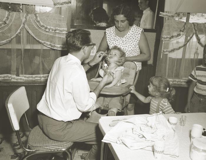 Captured in 1960, this historic photograph depicted a public health practitioner administering an oral polio vaccine (OPV) to a young child seated in her highchair, as her head was immobilized by her observant mother. The scenario had taken place during the 1960s Rhode Island Polio Epidemic Vaccination Campaign, and this family was amongst a case contact list.