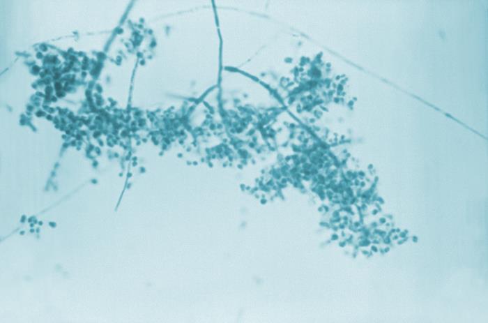 Under a magnification of 475X, this photomicrograph highlighted some of the ultrastructural morphology exhibited by the fungal organism, Trichophyton equinum, designated strain V563. The organism was cultivated on wort agar. Note the numerous microconidia that were clustered along the hyphal filaments.