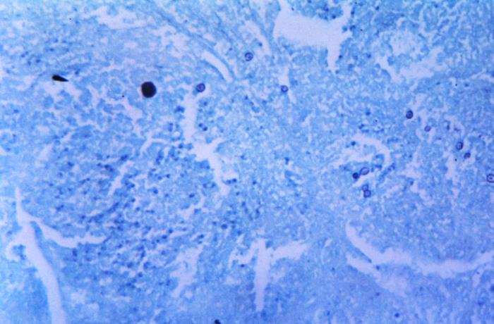 Under a low magnification, this is a photomicrograph of a methenamine silver stained, unidentified tissue sample, revealed the presence of spherules of the fungal organism, Coccidioides immitis, the cause of a disease known as coccidioidomycosis.